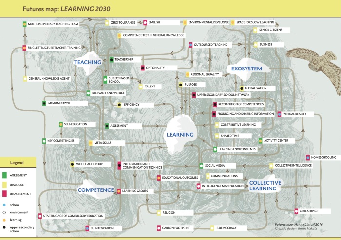 Each Delphi draws a map of some aspect of the future, outlining the possible terrains we may be heading into. The Delphi process can also be designed as a sort of research or monitoring program, where a future map of the phenomenon is consciously formed, refined round by round, or layered in a barometer-style monitoring as has been done in the Finnish National Agency for Education’s Future of Learning 2030 barometer.